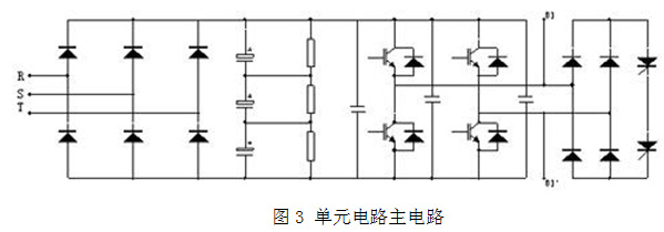 風(fēng)光高壓變頻器,采用若干個低壓逆變器功率單元串聯(lián)的方式實現(xiàn)直接高壓輸出,單元電路模塊化設(shè)計,維護簡單,互換性好,高壓主回路與控制器之間為光纖連接,強弱電隔離,安全可靠,該10kV高壓變頻器,變壓器有24組付邊繞組,分為8個功率單元∕相,三相共24個單元,采用36脈沖整流,輸入端的諧波成分低于國標(biāo)規(guī)定,高壓變頻器系統(tǒng)結(jié)構(gòu)如圖2所示,單元電路的主電路如圖3所示。