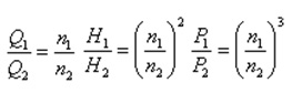 對離心式風(fēng)機而言,流體力學(xué)有以下原理:輸出風(fēng)量Q與轉(zhuǎn)速n成正比;輸出壓力H與轉(zhuǎn)速n的平方成正比;輸出軸功率P與轉(zhuǎn)速n的立方成正比;即: