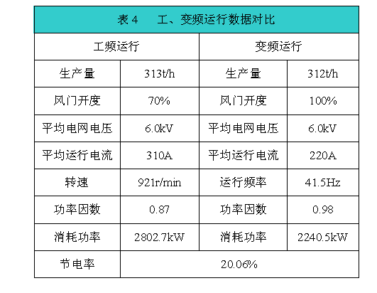 為了對(duì)窯尾高溫風(fēng)機(jī)系統(tǒng)變頻改造后的效果進(jìn)行評(píng)價(jià),在系統(tǒng)投入正常運(yùn)行后對(duì)設(shè)備實(shí)際使用和節(jié)電情況進(jìn)行了測定和數(shù)據(jù)分析。工、變頻生產(chǎn)工況基本相同,隨機(jī)抽取一個(gè)正常工作日,將系統(tǒng)切換工頻運(yùn)行采用風(fēng)門調(diào)節(jié)風(fēng)量,網(wǎng)側(cè)記錄運(yùn)行數(shù)據(jù),然后將系統(tǒng)切換變頻運(yùn)行,記錄運(yùn)行數(shù)據(jù),具體數(shù)據(jù)如表4所示。
