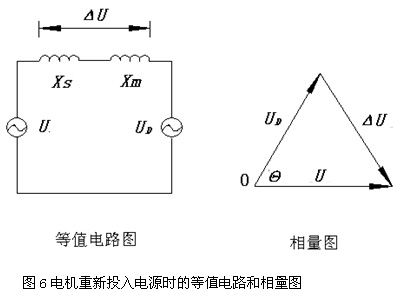 從圖4和圖5中可以看出,瞬間斷開電源后,電機(jī)感應(yīng)電壓有所衰減,同時(shí)感應(yīng)電壓與工頻電源電壓的相位已開始拉開,不同時(shí)刻投入工頻電源,將會(huì)產(chǎn)生不同的△U。圖6是電機(jī)重新投入電源時(shí)的等值電路和相量圖。