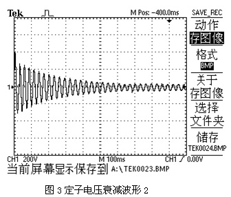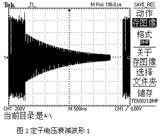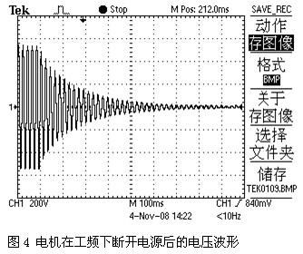 由于變頻器輸出的是PWM波,其相位不易觀察,測(cè)得在工頻狀態(tài)下的電壓波形進(jìn)行進(jìn)一步的分析。因?yàn)樽冾l器50Hz時(shí)的輸出電壓與工頻電壓作用在電機(jī)上基本時(shí)等效的,并不影響分析結(jié)果。圖4是一2.2KW電機(jī)在工頻電源下突然斷開電源后的電壓波形圖,由該圖可以看出,電壓波形沒有跳變,所以斷開瞬間感應(yīng)電動(dòng)勢(shì)與電源電壓是同相位的,其幅值也是基本相等的。隨著剩磁的慢慢消失,電壓幅值逐漸降低,同時(shí)伴隨著轉(zhuǎn)速的降低感應(yīng)電動(dòng)勢(shì)的頻率逐漸下降,其相位也逐漸與電源相位拉開。頻率越低,單位時(shí)間內(nèi)拉開的相位差也就越大。