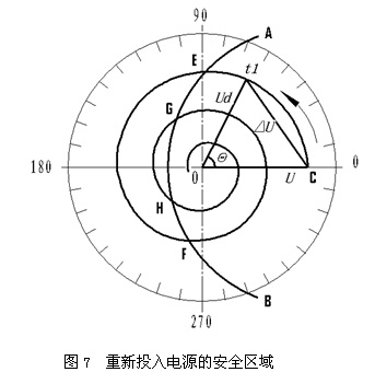 H點(diǎn)以后三個(gè)安全投入工頻電源的時(shí)間范圍,都是由相位和幅值共同作用的結(jié)果。我們也還可以分別從相位和幅值兩個(gè)方面入手來(lái)尋求解決辦法。