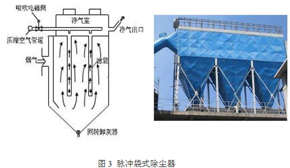 (2)脈沖袋式除塵器,如圖3所示,含塵氣體從袋式除塵器進口引入后,通過煙氣分配裝置均勻進入濾袋,在此過程中粉塵即被濾袋的外側所阻擋,經(jīng)過凈化處理的氣體從出口排出,當濾袋表面的粉塵不斷增加到一定的厚度,導致設備阻力上升到設定值時,微壓差控制信號有信號輸出??刂苾x發(fā)出信號,使噴吹系統(tǒng)工作,電磁脈沖閥打開,此時壓縮空氣從氣包順序經(jīng)脈沖閥和噴嘴向濾袋內(nèi)噴射,附于袋外的粉塵脫離濾袋落入灰斗,然后由回轉排灰閥將粉塵排出。