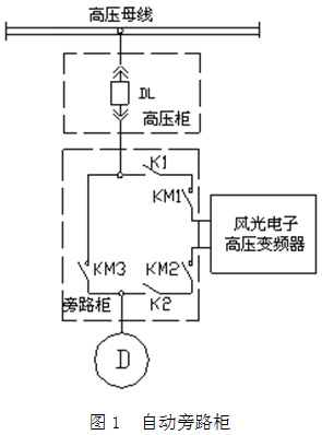 旁路柜主要配置:三個真空接觸器(KM1、KM2、KM3)和兩個刀閘隔離開關K1、K2。KM2與KM3實現電氣互鎖,當KM1、KM2閉合,KM3斷開時,電機變頻運行;當KM1、KM2斷開,KM3閉合時,電機工頻運行。另外,KM1閉合時,K1操作手柄被鎖死,不能操作;KM2閉合時,K2操作手柄被鎖死,不能操作。