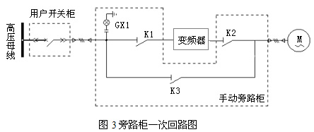 圖3手動(dòng)旁路柜中,共有3個(gè)高壓隔離開關(guān),為了確保不向變頻器輸出端反送電,K2與K3采用電磁互鎖操動(dòng)機(jī)構(gòu),實(shí)現(xiàn)電磁互鎖。當(dāng)K1、K2閉合,K3斷開時(shí),電機(jī)變頻運(yùn)行;當(dāng)K1、K2斷開,K3閉合時(shí),電機(jī)工頻運(yùn)行,此時(shí)變頻器從高壓中隔離出來,便于檢修、維護(hù)和調(diào)試。