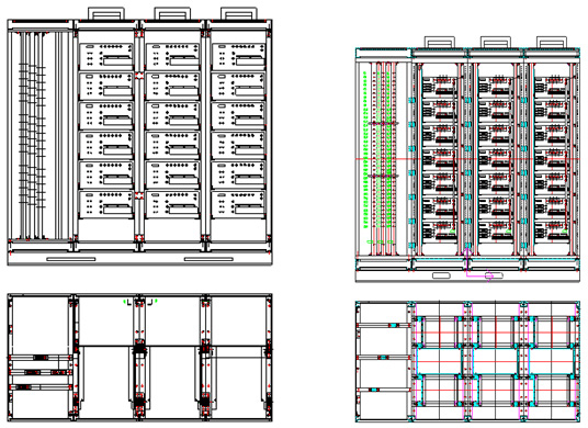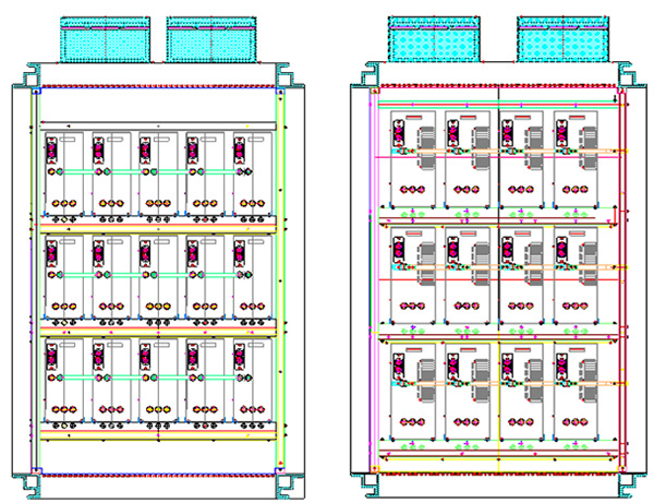 隨著高壓變頻器市場(chǎng)規(guī)模的不斷擴(kuò)大,用戶對(duì)變頻的苛求也越來越嚴(yán)格。作為產(chǎn)品開發(fā)商,也不斷為提升產(chǎn)品質(zhì)量與檔次作著不懈努力,所用柜體也由原來的單一種類向更寬范方向發(fā)展,其產(chǎn)品功能、質(zhì)量與外形都在不斷升級(jí)。同規(guī)格變頻器原體積如圖(4)。其單元結(jié)構(gòu)排布也有了更新的認(rèn)知,由于原來每相豎排所用電纜多、結(jié)構(gòu)復(fù)雜、附加成本大,便改為每相單元橫排,使變壓器次級(jí)引線分別對(duì)應(yīng)A、B、C三相,不再有接線柜,直接通過電纜托板到達(dá)各單元,不再迂回,其控制柜也由原來的600mm轉(zhuǎn)為400mm。另一個(gè)飛躍則是每相單元數(shù)量的減少,如10kV改為8單元/相,6kV改為5單元/相。功率單元數(shù)量少了,其整機(jī)質(zhì)量并沒有受到影響,相反其故障點(diǎn)卻相應(yīng)減少,加之電路結(jié)構(gòu)上星點(diǎn)漂移技術(shù)的應(yīng)用,使得變頻器性能更加優(yōu)越。功率柜具體排布情況,6kV5個(gè)單元,每相橫向分布,上、中、下三相如圖(5)所示。10kV如果采取單元前后放置,每相前4后4,如圖(6)所示: