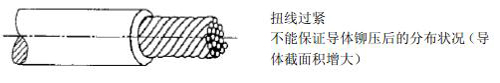 (1)捻頭過緊即捻頭角度過大,可使線芯脫出或斷掉,且會使壓接后的附著力減小,影響壓接可靠性,如圖4所示;