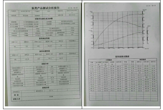 測(cè)試中心對(duì)水泵的流量、揚(yáng)程、轉(zhuǎn)速、軸功率及效率等性能參數(shù)進(jìn)行實(shí)際測(cè)試。在水泵不同流量的條件下,分別對(duì)水泵揚(yáng)程(進(jìn)口揚(yáng)程、出口揚(yáng)程、總揚(yáng)程)、功率、轉(zhuǎn)速、效率進(jìn)行測(cè)試。變頻電源根據(jù)用戶(hù)要求,輸出電壓10kV,帶載輸出穩(wěn)定,電壓、電流及諧波等各方面性能指標(biāo)滿足要求,達(dá)到了改造的預(yù)期目的。型式試驗(yàn)報(bào)告見(jiàn)圖6所示。