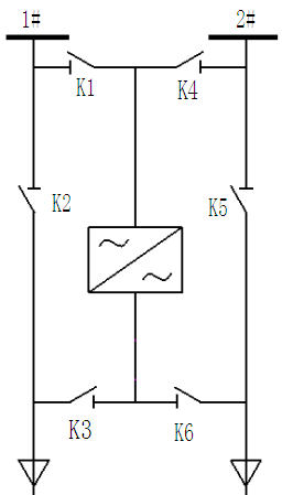 吉林某水務(wù)集團(tuán)結(jié)合該自身的實(shí)際情況,為滿足泵站的安全運(yùn)行需求,要求水泵電機(jī)一用一備設(shè)置,因此選擇了新風(fēng)光JD-BP38系列高壓變頻調(diào)速系統(tǒng)中一拖二手動(dòng)運(yùn)行的主回路,主回路圖如圖3所示。其中K1刀閘與K4刀閘互鎖,保證兩路高壓電源不會(huì)同時(shí)作用于變頻回路;K2刀閘與K3刀閘互鎖,保證工頻電源與變頻電源不會(huì)同時(shí)作用于電機(jī)M1;K5刀閘與K6刀閘互鎖,保證工頻電源與變頻電源不會(huì)同時(shí)作用于電機(jī)M2.