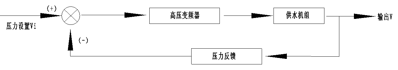為滿足不同時(shí)段不同地區(qū)的用水壓力需求,該水廠采用先進(jìn)的恒壓供水控制系統(tǒng),可以對(duì)水廠出口處的水壓值V進(jìn)行精確的處理和控制,并與壓力設(shè)置值Vi構(gòu)成閉環(huán)控制系統(tǒng)。恒壓供水系統(tǒng)原理如圖2所示。變頻器內(nèi)部的主控DSP采集供水壓力值V與用戶給定值Vi進(jìn)行比較和運(yùn)算,通過PID進(jìn)行調(diào)整,將結(jié)果轉(zhuǎn)換為頻率調(diào)節(jié)信號(hào)送至變頻器,直至達(dá)到供水壓力的給定值Vi。不管系統(tǒng)供水流量如何變化,供水壓力值V始終維持在給定壓力值Vi附近。
