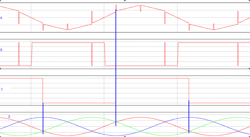 在這個電路中通過光耦TA、TB、TC的次級就可以獲取三相的過零信號,但在反向整流工作中仍然由于電源缺口在光耦次級會有比較窄的過零脈沖,但是完全可以通過CPLD適當(dāng)?shù)奶幚砣サ?,如圖3中的藍(lán)色,沒有經(jīng)過CPLD處理時獲取的信號: