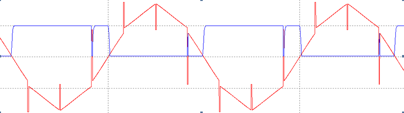 在模擬電路產(chǎn)生信號中,主要還是對線電壓或者相電壓過零點(diǎn)的獲取,在過零點(diǎn)的獲取中常用的是用運(yùn)放進(jìn)行過零比較。在反向整流工作中,由于電源的內(nèi)阻存在,在輸入電源上就存在IGBT開通或關(guān)斷時產(chǎn)生的缺口,如圖1所示: