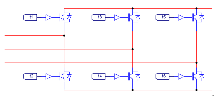 圖中t1\t2對應(yīng)A相,t3\t4對應(yīng)B相,t5\t6對應(yīng)C相,假設(shè)信號a\b\c進(jìn)行濾波延時處理后的信號為A\B\C,則6個驅(qū)動信號的邏輯處理為: