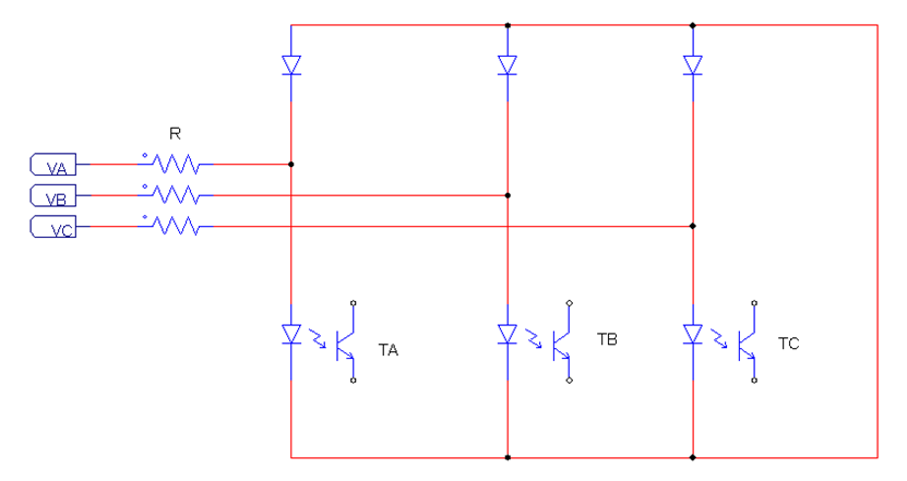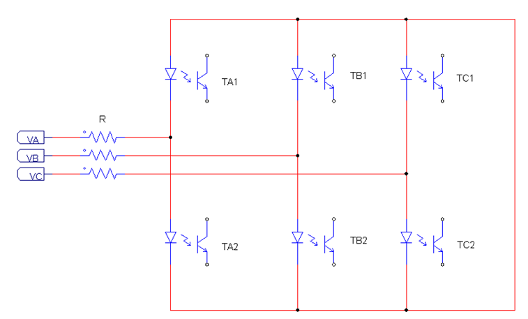 由于反向整流要求同步信號有比較高的對稱波形,上面的電路中只是取到了相電壓的大于零的部分,但由于光耦和二極管的壓降存在,可能會使得不對稱的情況產(chǎn)生,所以如果要正負(fù)半周對稱,可以考慮使用6個光耦來產(chǎn)生信號,如下圖: