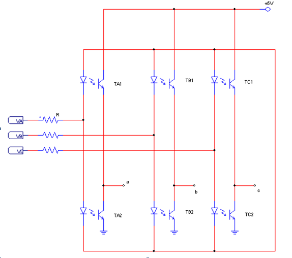 對于上述情況考慮采用光耦來獲取同步信號的過零點(diǎn),這樣就可以不用考慮三相中點(diǎn)電位問題,又能夠獲取相電壓的過零點(diǎn),初步方式如圖2所示: