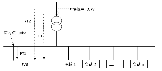 現(xiàn)場采用降壓式接入方式,10kVSVG通過變壓器接入35kV電網(wǎng),考核點(diǎn)在35kV側(cè),SVG通過并網(wǎng)變壓器接入電網(wǎng),變壓器接入點(diǎn)與考核點(diǎn)相同。如圖3所示。PT信號(hào)連接到PT1,并且二次接線端子PTA1與接入點(diǎn)電網(wǎng)一次端 子A必須是同一相;PTB1與接入點(diǎn)電網(wǎng)一次端子B必須是同一相,PTC1與接入點(diǎn)電網(wǎng)一次端子C必須是同一相。PT1用于SVG計(jì)算并網(wǎng)同步信號(hào),還用于計(jì)算考核點(diǎn)處的無功。