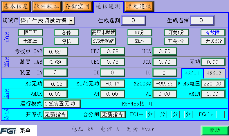 現(xiàn)場與后臺(tái)的通訊調(diào)試主要是SVG與后臺(tái)的信號(hào)與操作命令的傳輸。包括SVG傳給后臺(tái)的遙信、遙測信號(hào)以及后臺(tái)控制SVG的遙調(diào)、遙控指令??赏ㄟ^人機(jī)界面的“信息查詢”/“遙信遙測”界面模擬生成數(shù)據(jù),每個(gè)地址里生成不同的數(shù)據(jù),在界面上觀測看到的數(shù)據(jù)是否與生成的一致進(jìn)行對(duì)比調(diào)試。如圖4所示。