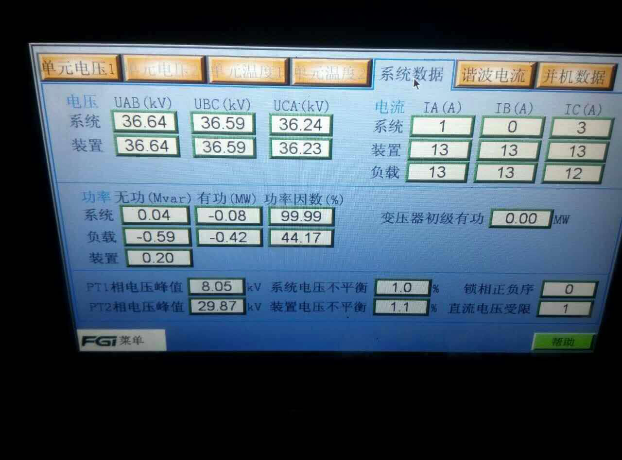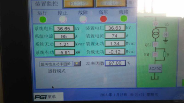 617-2011要求“大中型光伏電站應(yīng)配置無功電壓控制系統(tǒng),具備無功功率及電壓控制能力。根據(jù)電力調(diào)度部門指令,光伏電站自動(dòng)調(diào)節(jié)器發(fā)出(或吸收)無功功率,控制光伏電站并網(wǎng)點(diǎn)電壓在正常運(yùn)行范圍內(nèi),其調(diào)節(jié)速度和控制精度應(yīng)能滿足電力系統(tǒng)電壓調(diào)節(jié)的要求。低電壓穿越過程中光伏電站宜提供動(dòng)態(tài)無功支持?!薄禛B/T29321-2012光伏發(fā)電站無功補(bǔ)償技術(shù)規(guī)范》中5.2條款要求,“光伏電站無功補(bǔ)償裝置應(yīng)能夠跟蹤光伏電站處理的波動(dòng)及系統(tǒng)電壓控制要求,并快速響應(yīng)。動(dòng)態(tài)無功響應(yīng)時(shí)間應(yīng)不大于30ms。”該光伏電站業(yè)主通過招標(biāo)方式,選擇了新風(fēng)光生產(chǎn)的FGSVG-3.0/35T-O型高壓動(dòng)態(tài)無功補(bǔ)償和諧波治理裝置,配置在光伏發(fā)電現(xiàn)場,用于電網(wǎng)無功補(bǔ)償和諧波治理,設(shè)備一次成功投運(yùn),達(dá)到了預(yù)期目的。