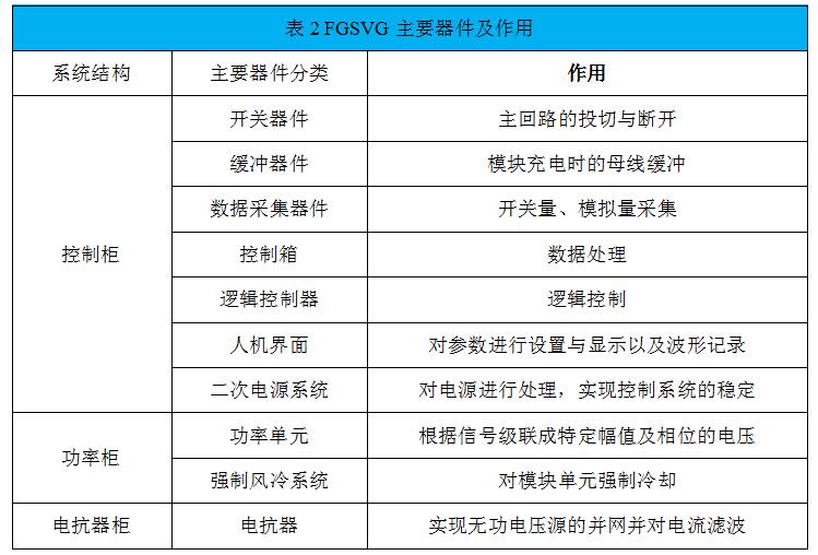 FGSVG系列產(chǎn)品主要分為三部分:控制柜、功率柜、電抗器柜。其中功率柜實現(xiàn)了統(tǒng)一設(shè)計,方便產(chǎn)品的擴展及穩(wěn)定性。各電壓等級的裝置由控制柜、功率柜及電抗器柜(或空心電抗)組成。各柜體中主要器件及作用如表2所示。