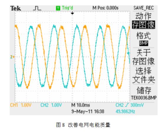 響應(yīng)速度小于5ms,對于電網(wǎng)電壓的跌落和閃變具有一定抑制作用并網(wǎng)波形(如圖8所示):