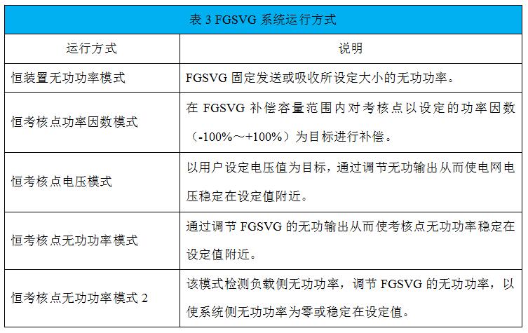 運行方式包含了五種:恒裝置無功功率模式、恒考核點無功功率模式、恒考核點功率因數(shù)模式、恒考核點電壓模式、恒考核點無功功率模式2。由下拉框選定,并于右側(cè)設(shè)定目標(biāo)值,目標(biāo)值可隨時更改,更改后可根據(jù)檢測值檢查補償效果。如表3所示,對“運行方式”進行了詳細(xì)說明。