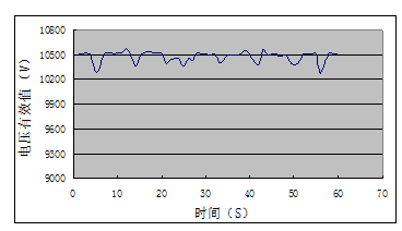 FGSVG運行后無功功率補償效果非常理想,系統(tǒng)側平均功率因數(shù)穩(wěn)定在0.95以上,系統(tǒng)側的無功功率降低到300kvar以下。FGSVG投運后對沖擊性無功功率快速補償,有效的抑制了電網(wǎng)電壓的閃變,電網(wǎng)電壓最大波動200V,基本穩(wěn)定在10500V附近,保證了用電設備的安全運行,如圖4所示。