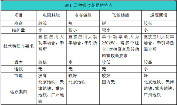 從較早的在牽引變電所設(shè)置再生能量電阻消耗裝置的應(yīng)用到近幾年電容儲(chǔ)能、飛輪儲(chǔ)能技術(shù)、再生電能逆變回饋設(shè)備發(fā)展,再生制動(dòng)能量吸收技術(shù)在不斷研制和持續(xù)改進(jìn),在國內(nèi)外軌道交通線路上得到應(yīng)用。針對(duì)目前使用的四種吸收裝置方案,表1給出了四種吸收裝置的特點(diǎn):