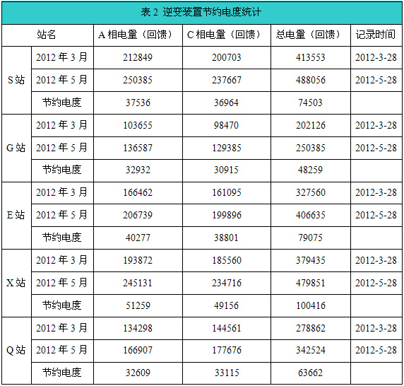 根據(jù)業(yè)主電度表計(jì)量的數(shù)據(jù),重慶某線路逆變裝置節(jié)電效果明顯。具體數(shù)據(jù)如表2;