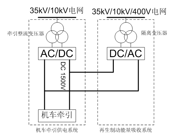 再生制動(dòng)能量吸收裝置是并聯(lián)在1500V/750V直流系統(tǒng)中,經(jīng)過(guò)逆變裝置變成交流,經(jīng)隔離變壓器輸入到電網(wǎng)(35kV/10kV/400V)。