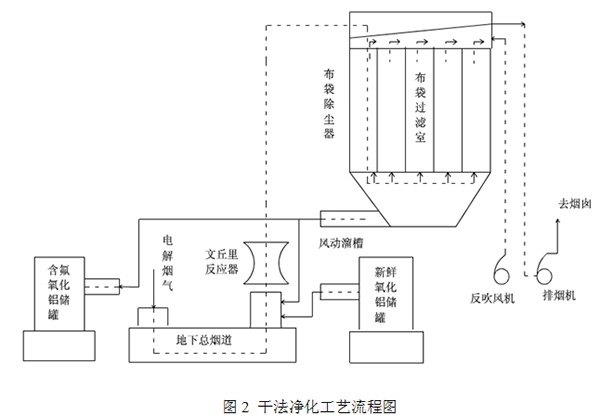 (2)吸附反應。將吸附劑新鮮的氧化鋁粉加入到電解煙氣中,并使之與煙氣充分接觸而吸附煙氣中的氟化氫,然后送到布袋除塵器袋濾室。
